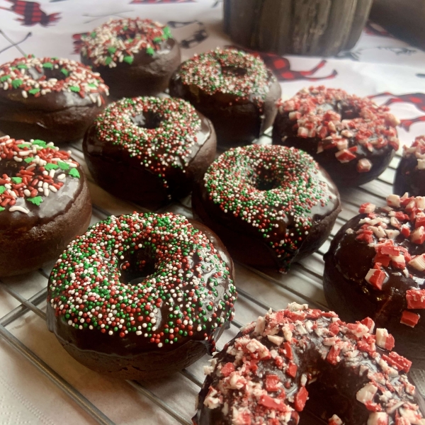 Baked in the oven and decorated with a minty glaze and crushed candy, these chocolate-peppermint donuts won't last long on your breakfast table.