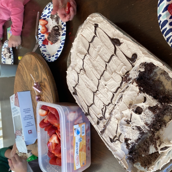 Bake in the preheated oven until a toothpick inserted into the center comes out clean, about 35 minutes. Remove cake from the oven and allow it to cool in the pan until it is no longer hot to the touch. While the cake is still warm, poke lots of holes all over the cake with a small skewer or a fork.