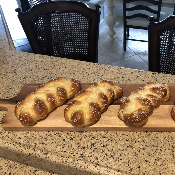 Separate the dough into 5 even portions, then separate each of those into thirds. Roll each of those into ropes about 12 inches long. Braid sets of three ropes together, pinching the ends to seal, and tucking them under for a better presentation. Place the loaves onto baking sheets lined with parchment paper. Loaves should be spaced 4 inches apart. Set in a warm place to rise until your finger leaves an impression behind when you poke the loaf gently.