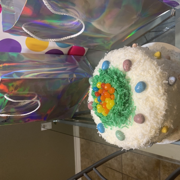 A pretty 3-layered coconut cake with green-tinted coconut and colorful jelly beans on top is surprisingly easy to make, thanks to using a yellow or white cake mix. Creamy coconut-flavored buttercream frosting finishes the cake in style.