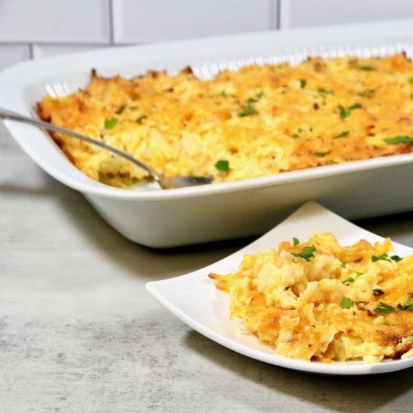 Drain defrosted hash browns well (I used a salad spinner). Combine drained hash browns, 2 cups Colby cheese, cream of chicken soup, sour cream, onion, butter, egg, garlic powder, salt, and pepper in a large bowl.