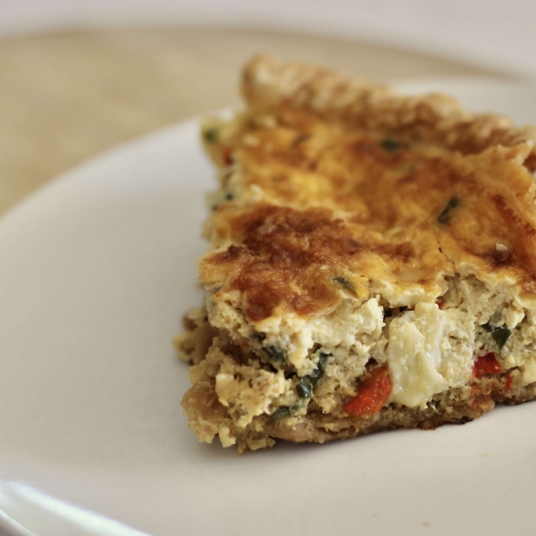 A luscious egg pie with crabmeat, red pepper, Swiss cheese, and a hint of white wine. Serve for a delicious luncheon!