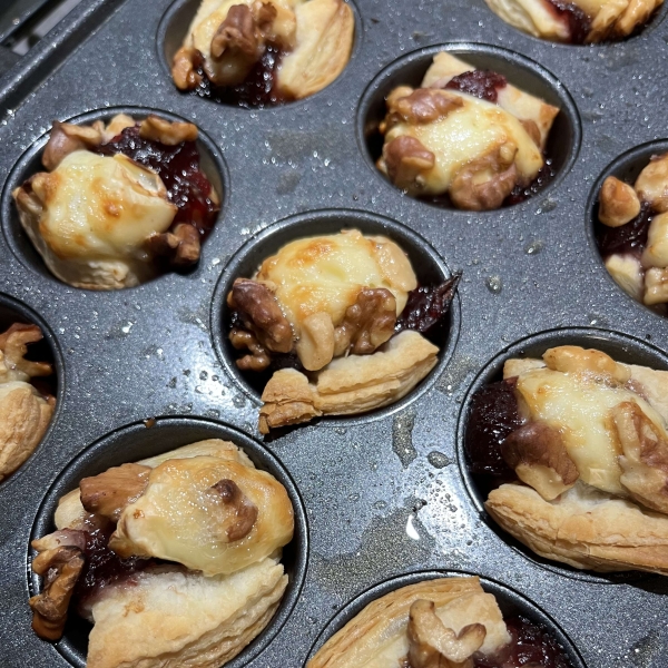 Add 1 teaspoon cranberry sauce to each pastry-lined muffin cup, then press in a piece of Brie and top with 1 teaspoon chopped walnuts. Season each bite with a pinch of sea salt. Transfer muffin pan to the refrigerator and chill for at least 30 minutes, or cover and chill for up to 3 days.