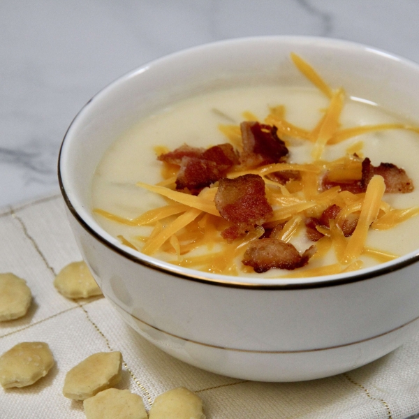 Celery and carrot flavor the stock of this tasty puréed potato soup made easy with a can of evaporated milk. Serve garnished with chopped chives.