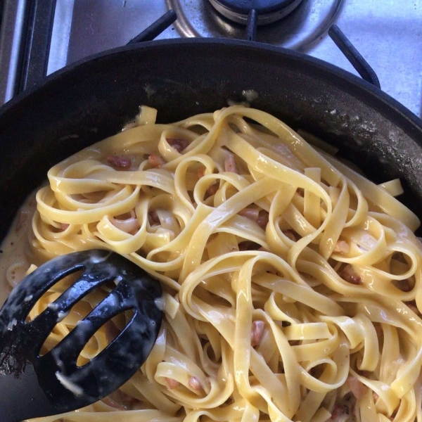 This carbonara recipe with cream, whipped egg, and Parmesan cheese features crisp bacon bits tossed with hot, buttery noodles for an indulgent dish.