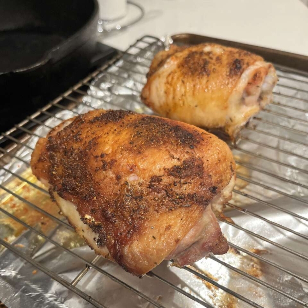 Pat chicken thighs dry with paper towels. Lift up skin gently; sprinkle salt, pepper, and garlic powder under the skin. Replace skin. Season skin and underside of the thighs with salt, pepper, and garlic powder.
