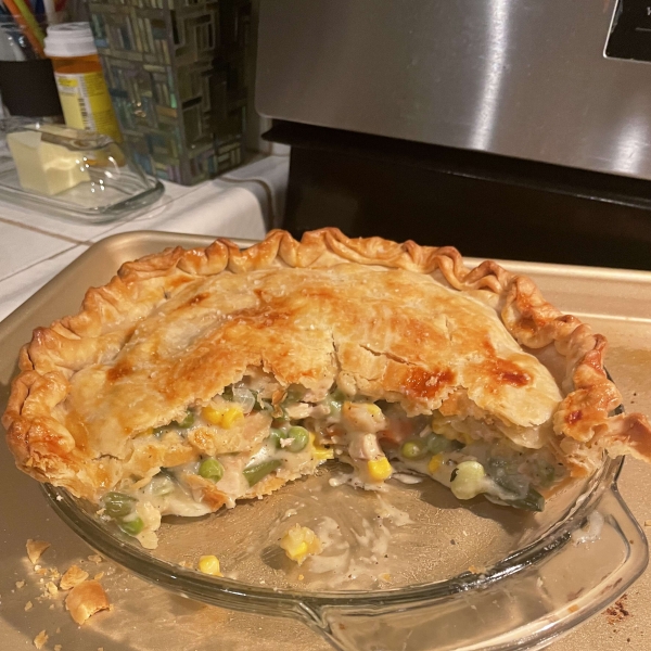 Set out two 9-inch pie dishes. Fit one pie pastry into the bottom of each dish. Spoon 1/2 of the pot pie filling into each dish, then lay the remaining pie pastries over top. Pinch and roll the top and bottom pastries together at the edges to seal. Use a sharp knife to cut several small slits in each top pastry to allow steam to release while cooking. Place pies on baking sheets.