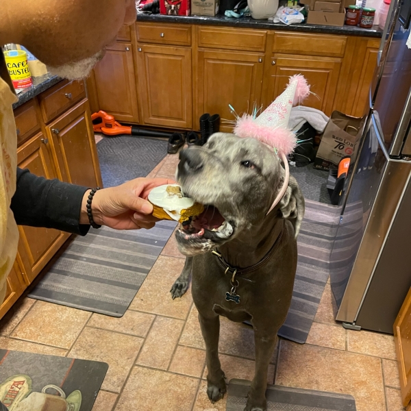 This dog birthday cake is super fun to make. I made this for my dog, and she ate it all up. The honey is optional, but it makes the cake a sweeter treat for the dog. And yes, I tried some — it's pretty good.