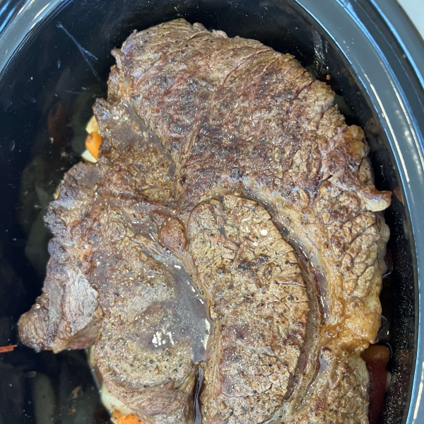 Make the best pot roast with this easy slow cooker recipe! The roast cooks on top of vegetables, resulting in tender meat and veggies for a comforting meal.