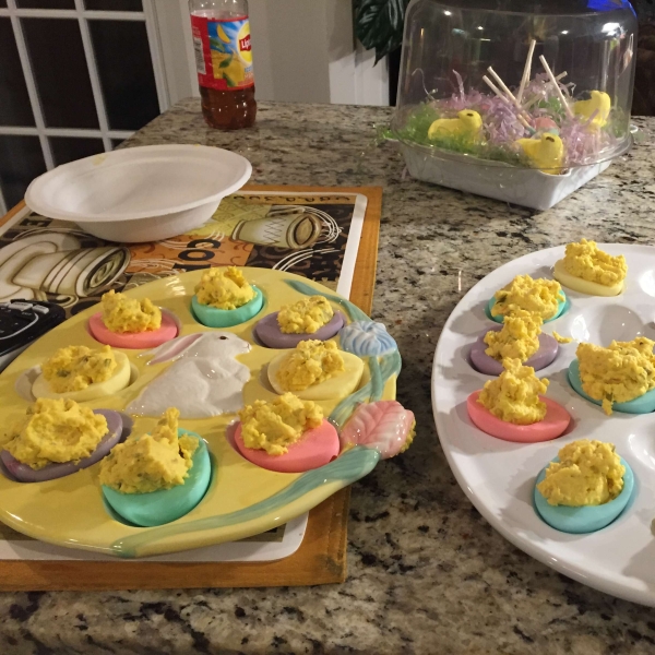 Pipe or spoon egg yolk filling into colored egg white halves; cover and chill before serving, at least 30 minutes.