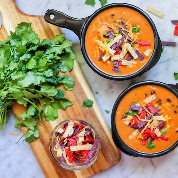 Turn canned cream of chicken soup into a cheesy chicken enchilada soup with the easy addition of enchilada sauce, Cheddar cheese, beans, and chicken.