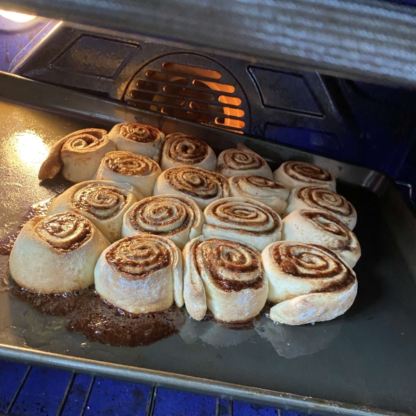 Bake in the preheated oven until golden, 15 to 20 minutes. Remove from the oven and immediately turn out onto a tray or plate to cool; this allows the inside mixture to drip back into the rolls as they cool.