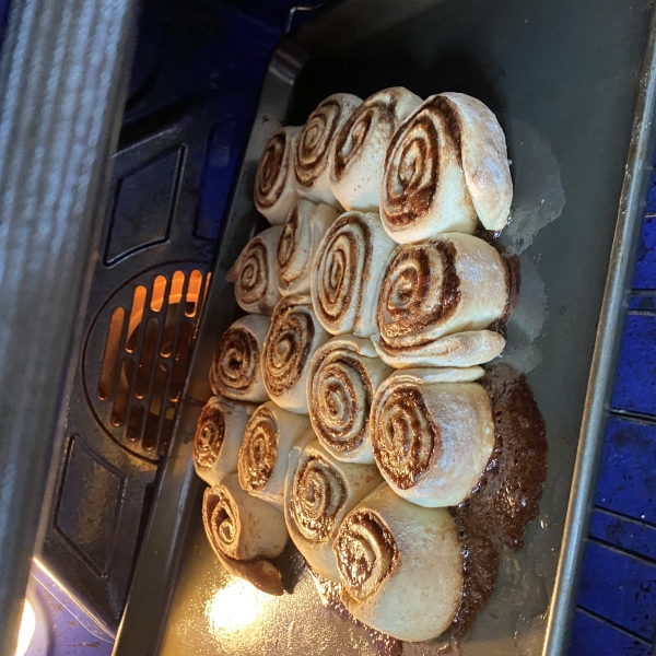 Place rolls, cut-side down and almost touching, into a greased 9x13-inch pan. Cover loosely with plastic wrap and let rise until doubled in size, 30 to 40 minutes.