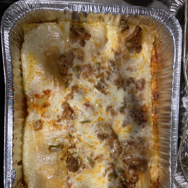 This easy lasagna recipe is made with lean ground beef, three types of cheese, and a jar of spaghetti sauce for a hearty, family-pleasing meal.