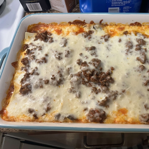 This easy lasagna recipe is made with lean ground beef, three types of cheese, and a jar of spaghetti sauce for a hearty, family-pleasing meal.