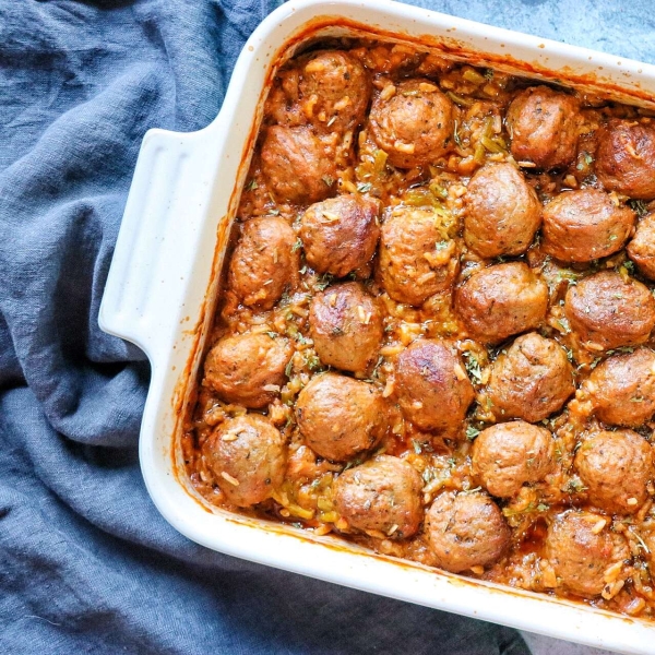 Frozen meatballs are an easy shortcut in this quick casserole made with tomato soup and instant rice.