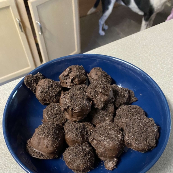 Place each ball in melted chocolate and use two forks to roll it until fully coated. Lift the ball with both forks and allow excess chocolate to drip off. Place coated truffle on a wax paper-lined baking sheet and sprinkle with reserved cookie crumbs to decorate. Repeat to make remaining truffles.