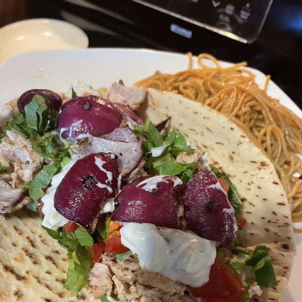 Serve sliced chicken in a warm pita topped with tzatziki sauce, lettuce, tomato, and red onion.