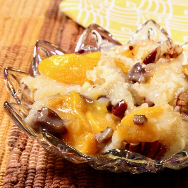 Preheat the oven to 350 degrees F (175 degrees C). Pour peaches and juice into a 9x13-inch baking dish.