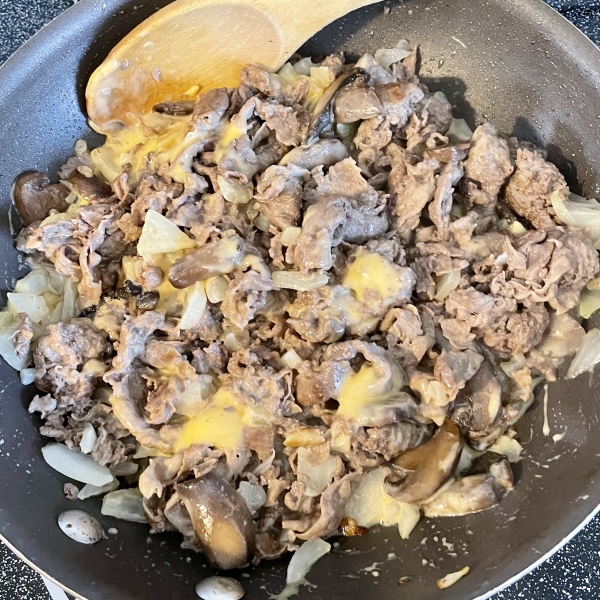 Turn off the heat; place cheese on top of steak and vegetable mixture so they can melt. Scoop mixture into sliced baguette; pour some of the juices on top.