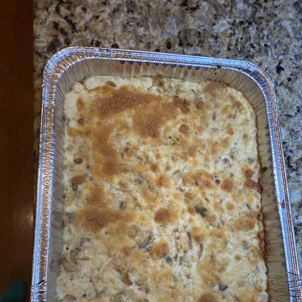 Turkey Tetrazzini turns leftover turkey into a comforting crowd-pleaser; this creamy casserole includes noodles, mushrooms, and crunchy almonds.