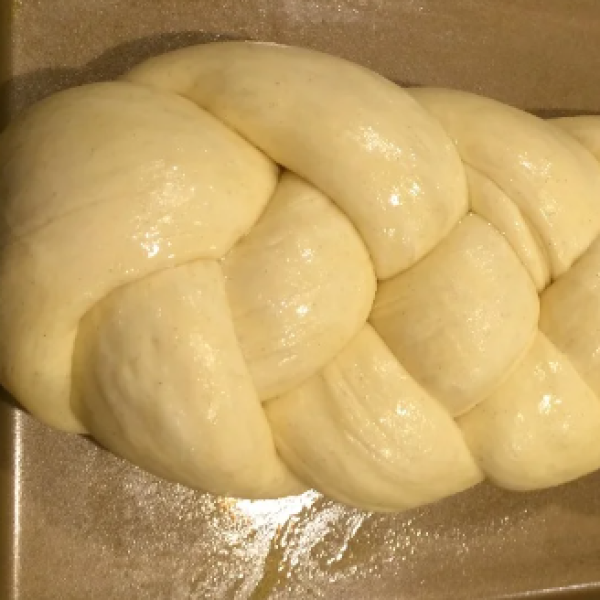 Deflate the dough and turn it out onto a lightly floured surface. Divide the dough into three equal pieces and then divide each piece into thirds. Roll out with your hands until the pieces are long enough to braid. Braid three pieces together to form a loaf; repeat twice to make three loaves. Place on lightly greased baking sheets and let rise for 40 minutes, until nearly doubled. Meanwhile, preheat oven to 350 degrees F (175 degrees C).
