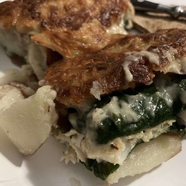 Layers of potatoes, fish, and fresh spinach are covered in a homemade bechamel sauce and sprinkled with two kinds of cheese in this hearty fish and potato casserole.