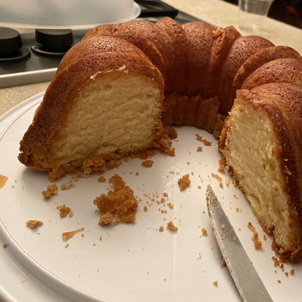 This five flavor pound cake is flavored with coconut, lemon, rum, butter, and vanilla extracts for a moist, tender cake with a sweet, sugary glaze.