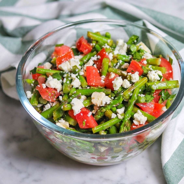 In this recipe, asparagus, tomatoes, green onion and cilantro are tossed with a light vinegar and oil dressing. This is a fresh summer salad inspired by Mediterranean and Asian flavors.