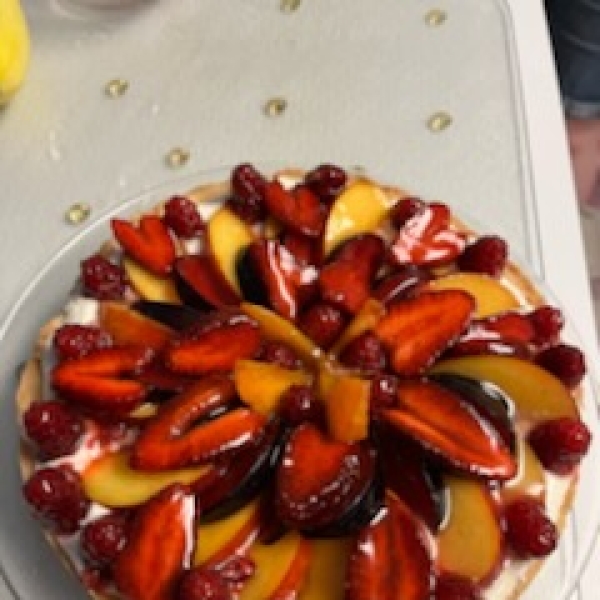 I always get recipe requests when I bring this fruit tart to parties. The mascarpone cheese adds a smooth richness that keeps everyone coming back for more. With the vibrant colors of the fresh fruit, this tart not only tastes great but is very eye catching. You can use any fruit to top the tart.