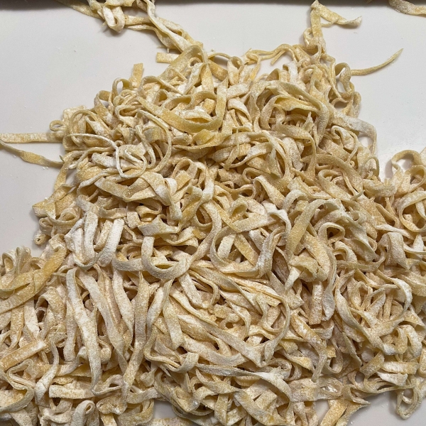 Roll out dough with a pasta machine or a rolling pin to desired thickness. Cut into your favorite style of noodle or stuff with your favorite filling to make ravioli.