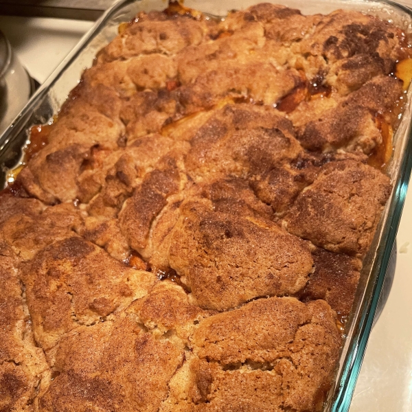Remove peaches from oven, and drop spoonfuls of topping over them. Sprinkle entire cobbler with the sugar and cinnamon mixture. Bake until topping is golden, about 30 minutes.