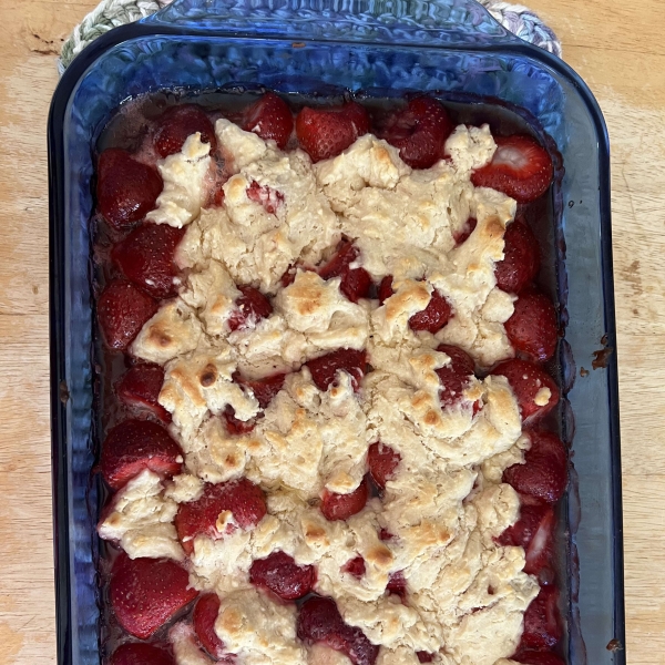This strawberry cobbler with whole strawberries and a tender biscuit-like topping is baked until golden and bubbling for a delicious summertime dessert.