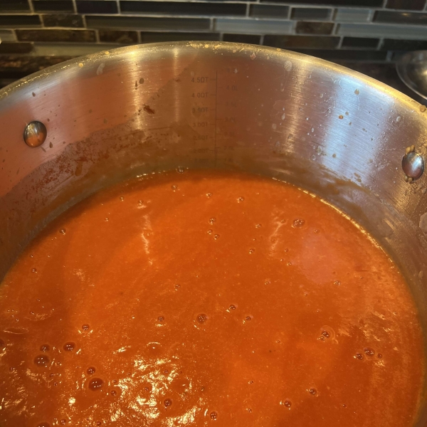In the now empty stockpot, melt the butter over medium heat. Stir in the flour to make a roux, cooking until the roux is a medium brown. Gradually whisk in a bit of the tomato mixture, so that no lumps form, then stir in the rest. Season with sugar and salt, and adjust to taste.