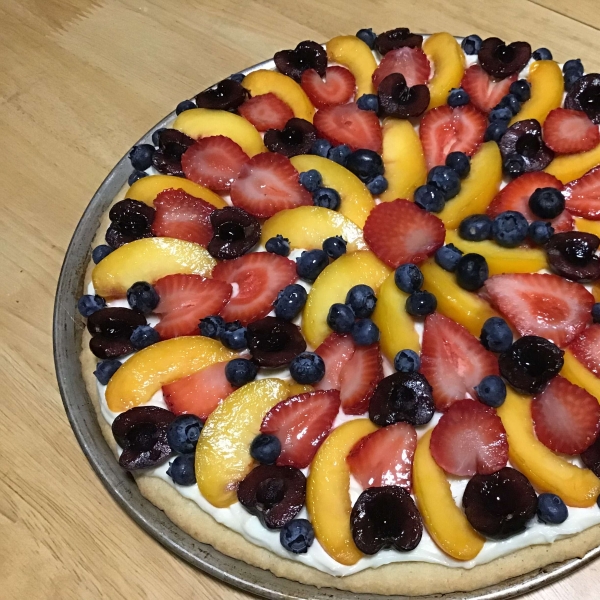 Fruit pizza is a beautiful and fun dessert perfect for a BBQ or party. Made with cookie dough, sweetened cream cheese and decorated with fresh fruit.