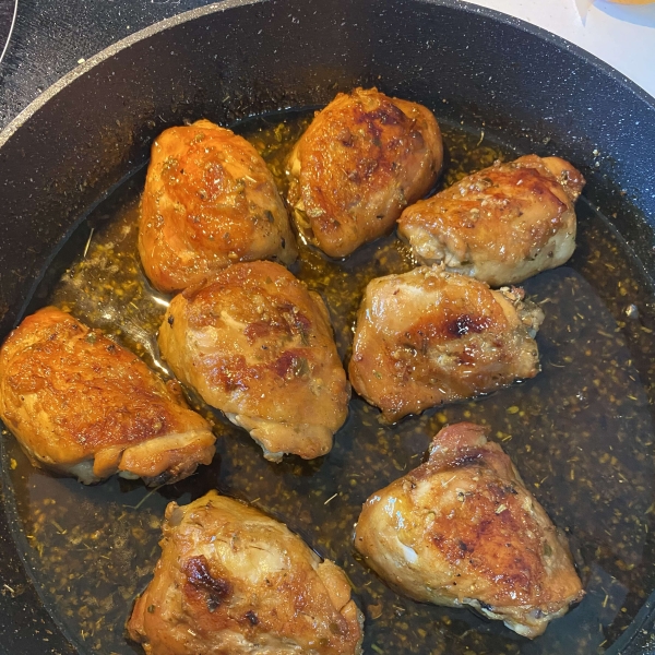 Melt remaining 1 tablespoon butter in the skillet, stirring to loosen any browned bits on the bottom. Add garlic; cook and stir until fragrant, about 30 seconds. Stir in brown sugar, honey, oregano, thyme, and basil until well combined. Turn off the heat and return chicken to the skillet, skin-side down.