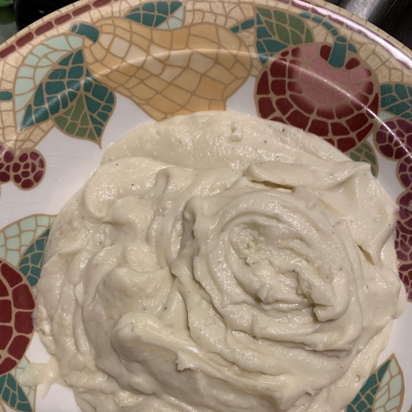 Transfer 1/2 of the cauliflower to a food processor; cover and blend on high. Add remaining cauliflower florets, one at a time, until vegetables are creamy. Blend in cooked garlic, Parmesan cheese, cream cheese, salt, and black pepper.