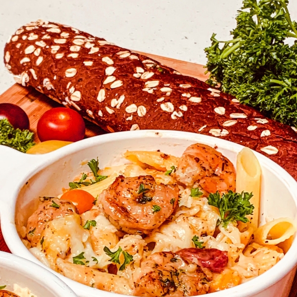 Want a super satisfying, quick and easy dinner? Then this buttery garlic shrimp pasta bake is definitely a family pleasing meal idea that you should try!