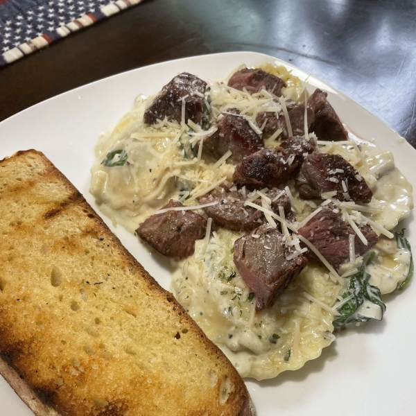 Chef John serves mini ravioli in a creamy sauce flavored with tangy Gorgonzola and Parmesan for a quick gourmet dish. It's topped with diced apple and toasted walnuts.
