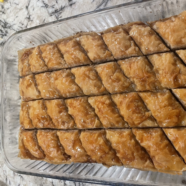 Using a sharp knife cut into diamond or square shapes all the way to the bottom of the pan. You may cut into 4 long rows the make diagonal cuts. Bake for about 50 minutes until baklava is golden and crisp.