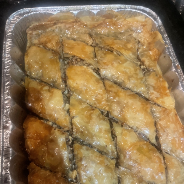 Remove baklava from oven and immediately spoon sauce over it. Let cool. Serve in cupcake papers. This freezes well. Leave it uncovered as it gets soggy if it is wrapped up.