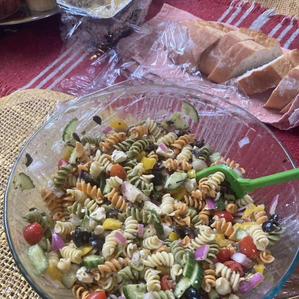 Combine pasta, tomatoes, green and red peppers, onion, cucumber, olives, and feta cheese in a large bowl. Pour vinaigrette over the pasta mixture and mix well. Cover and chill for 3 hours before serving.