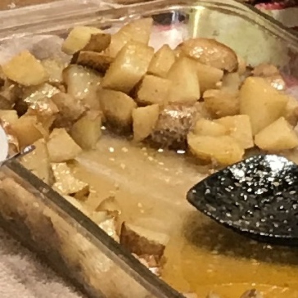Mix olive oil, lemon juice, garlic, seasoned salt, chicken soup base, and Greek seasoning together in a separate dish. Pour over potatoes and stir to coat evenly.