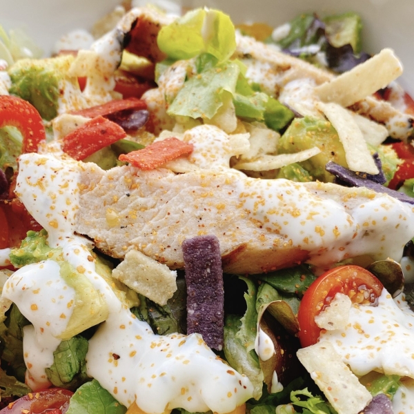 This salad with grilled chicken breast, bacon, and ranch dressing is a quick and easy protein-packed lunch on any day of the week.