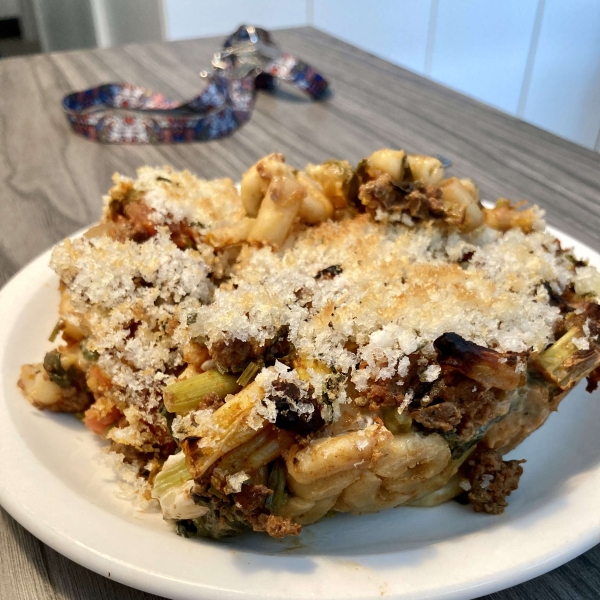 A classic hamburger casserole recipe. Ground beef, pasta, and veggies are baked into a creamy, cheesy casserole for a comfort food weeknight dinner.