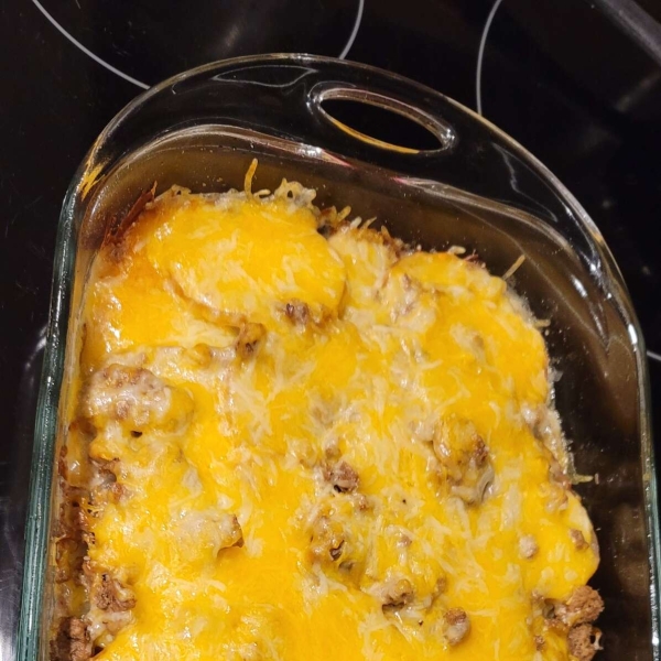 Hamburger potato casserole is an oldie but a goodie! This recipe layers ground beef and potatoes with mushroom soup, onion, and Cheddar cheese.