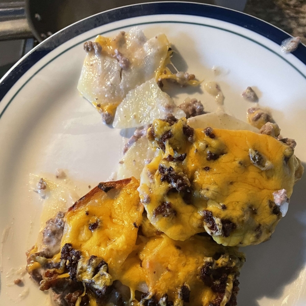 Mix condensed soup, milk, onion, salt, and pepper in a medium bowl until combined. Alternately layer the potatoes, soup mixture, and browned ground beef in a 2-quart baking dish.