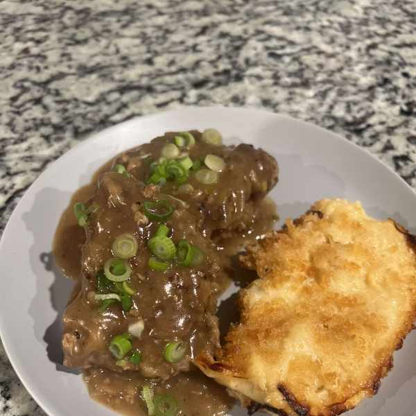 These tasty hamburger "steaks" are smothered in gravy and onions. It's a great way to dress up a pound of ground beef using easy ingredients.