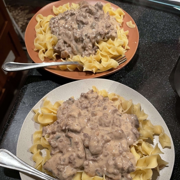This beef stroganoff recipe made with hamburger meat, onion, and creamy condensed soup is served over egg noodles for a quick, comforting meal.