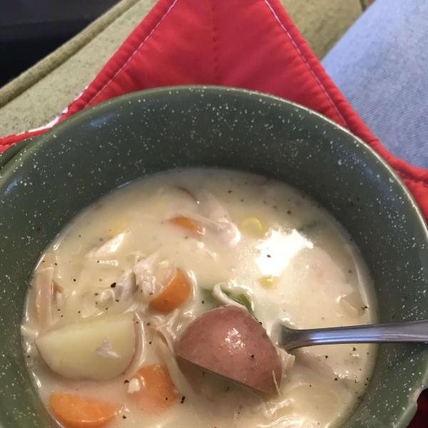 This hearty, creamy homemade chicken stew is packed with fresh and frozen vegetables and tender bites of chicken.